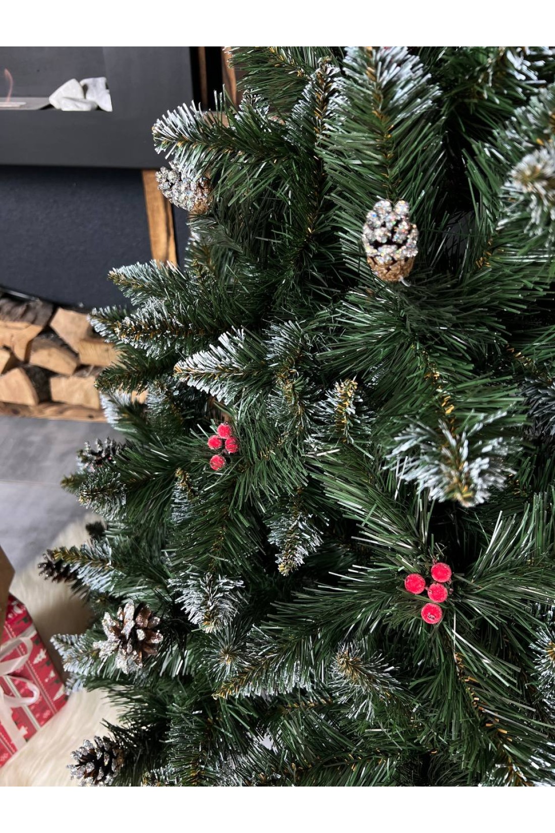 Пышные ветви украшены натуральными шишками и яркими ягодами калины, создавая эффект настоящей лесной ели, покрытой зимним декором. Материал плотный и упругий, что гарантирует долговечность и реалистичный внешний вид.