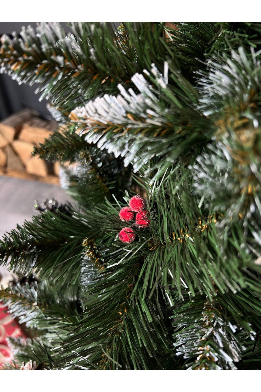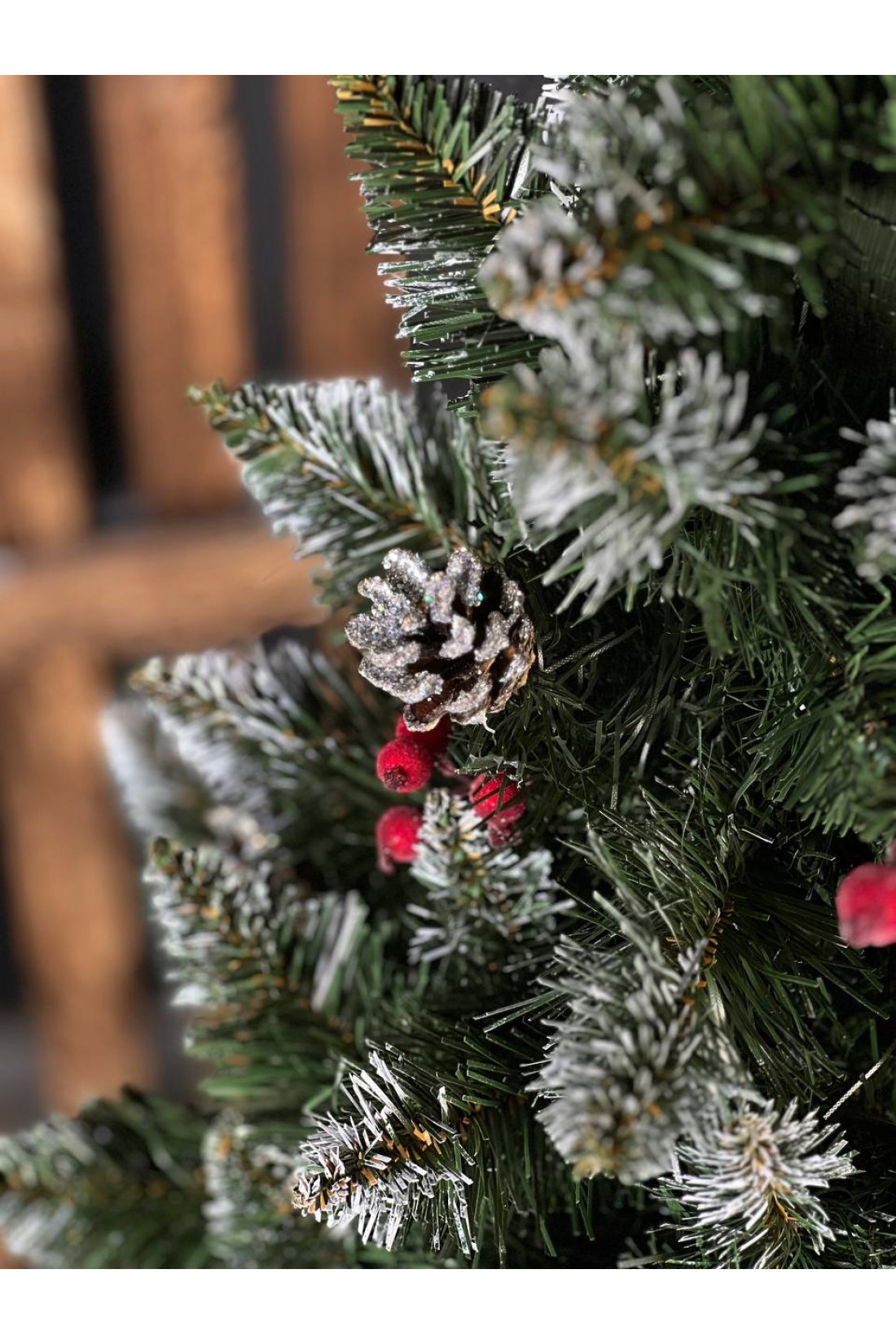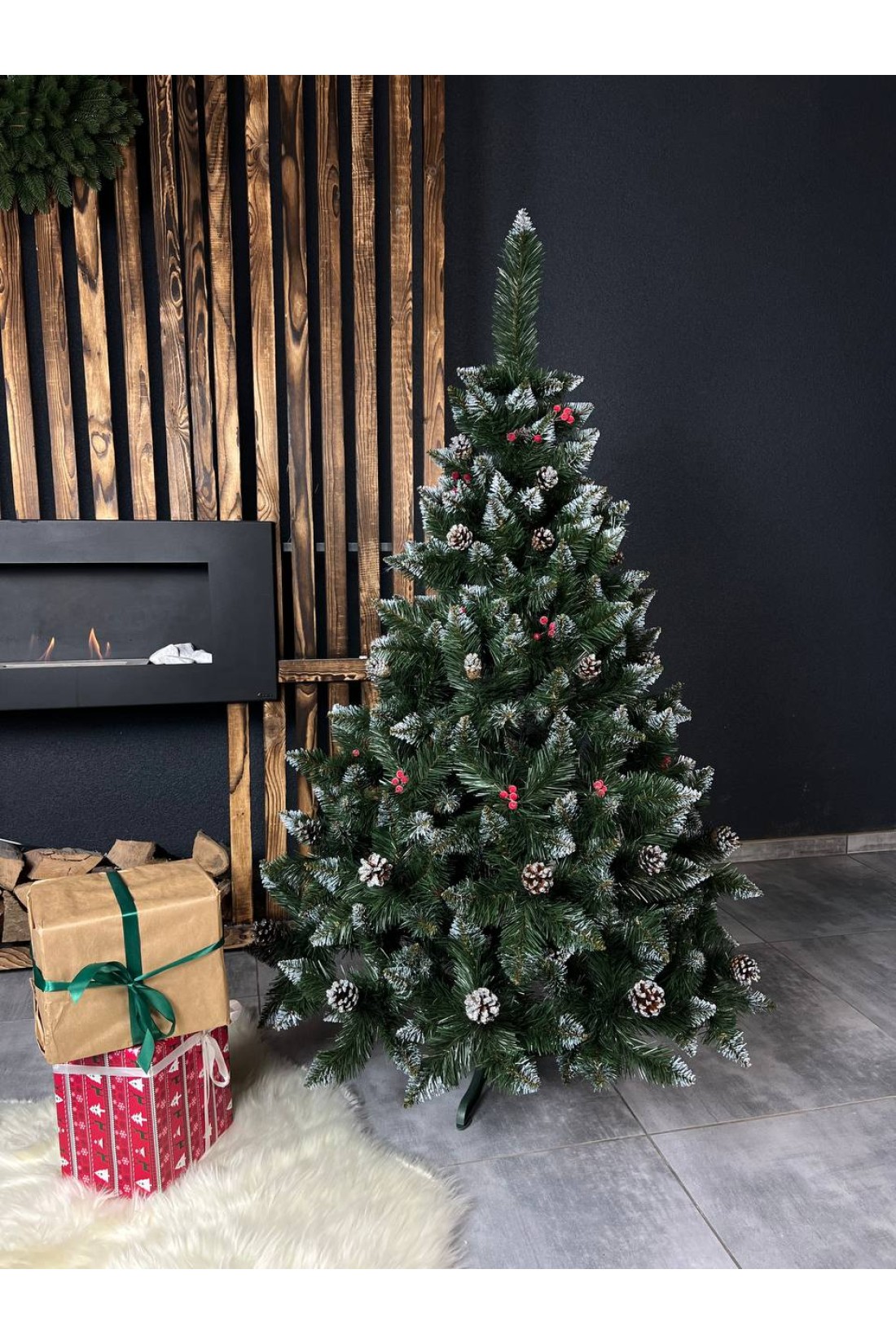 Густі, м’які гілочки ялинки прикрашені натуральними шишками та червоними ягідками калини, що надають деревцю святкового вигляду й відтворюють атмосферу справжньої зимової природи.